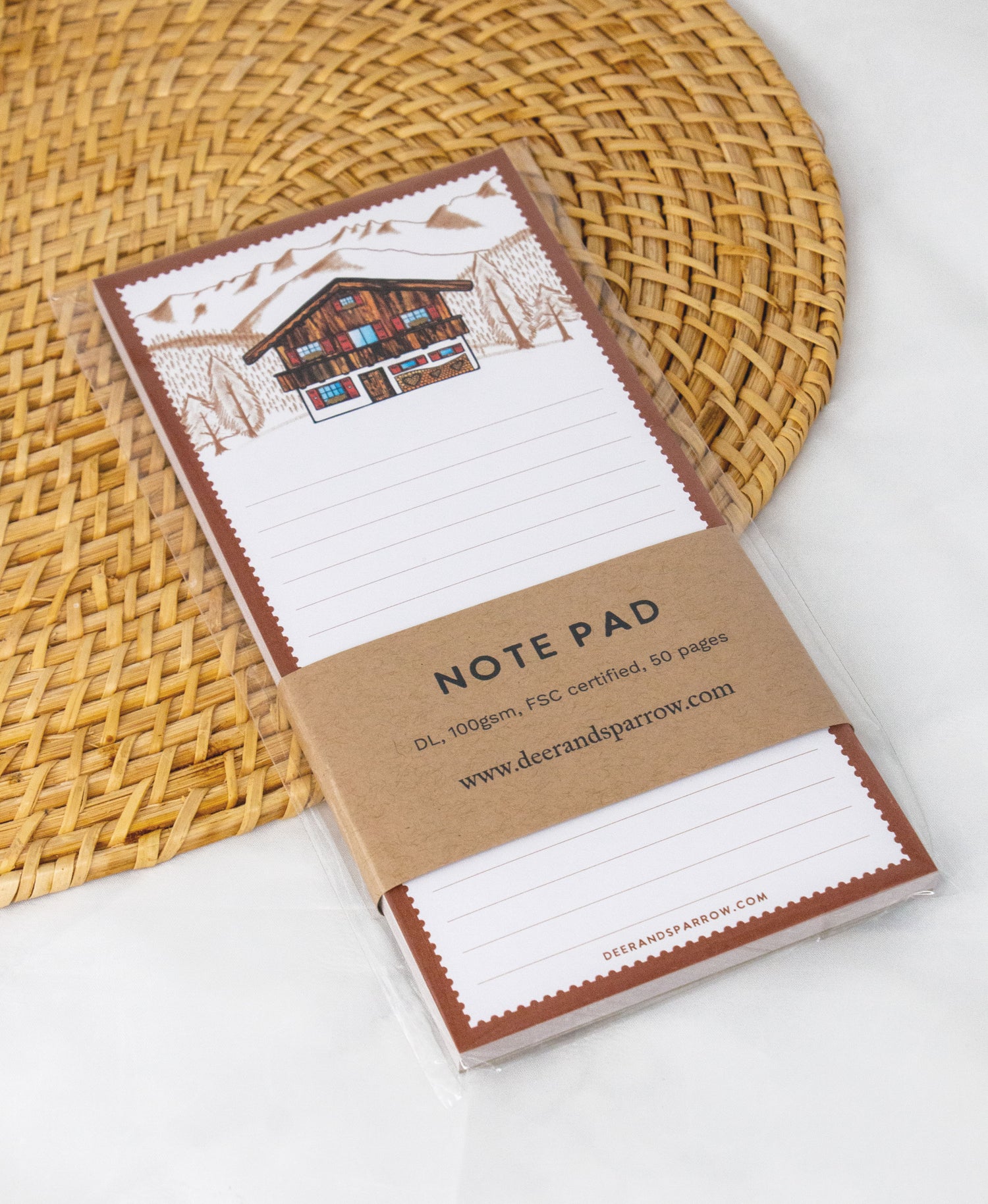 A delightful 50-page notepad featuring an alpine chalet design—ideal for jotting down thoughts, dreams, and to-do lists.