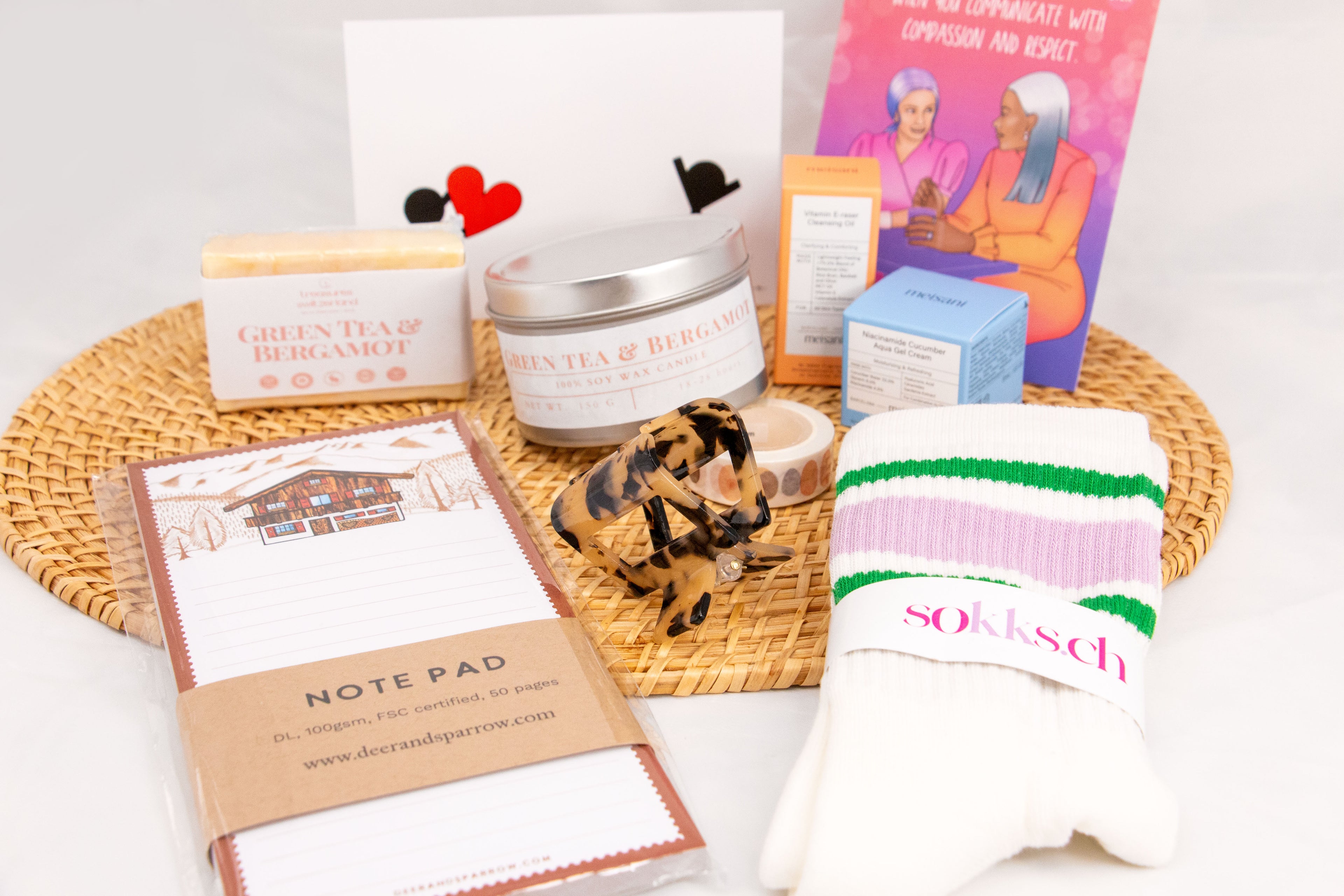 A beautifully designed washi tape, a chic medium-sized hair claw (random color included), and a charming “Love” postcard—perfect for adding a personal touch.
