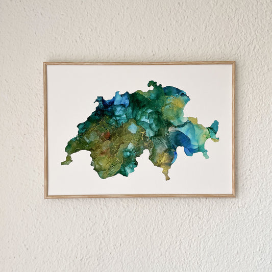 Swiss Serenity: A Stunning Abstract Ink Painting in the shape of Switzerland - A4 Giclée Print