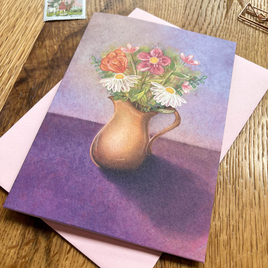 All-Occasion Floral Card – Jug of Flowers on Purple – Blank Inside