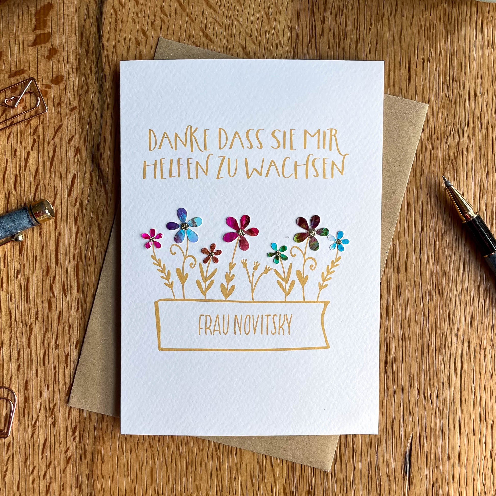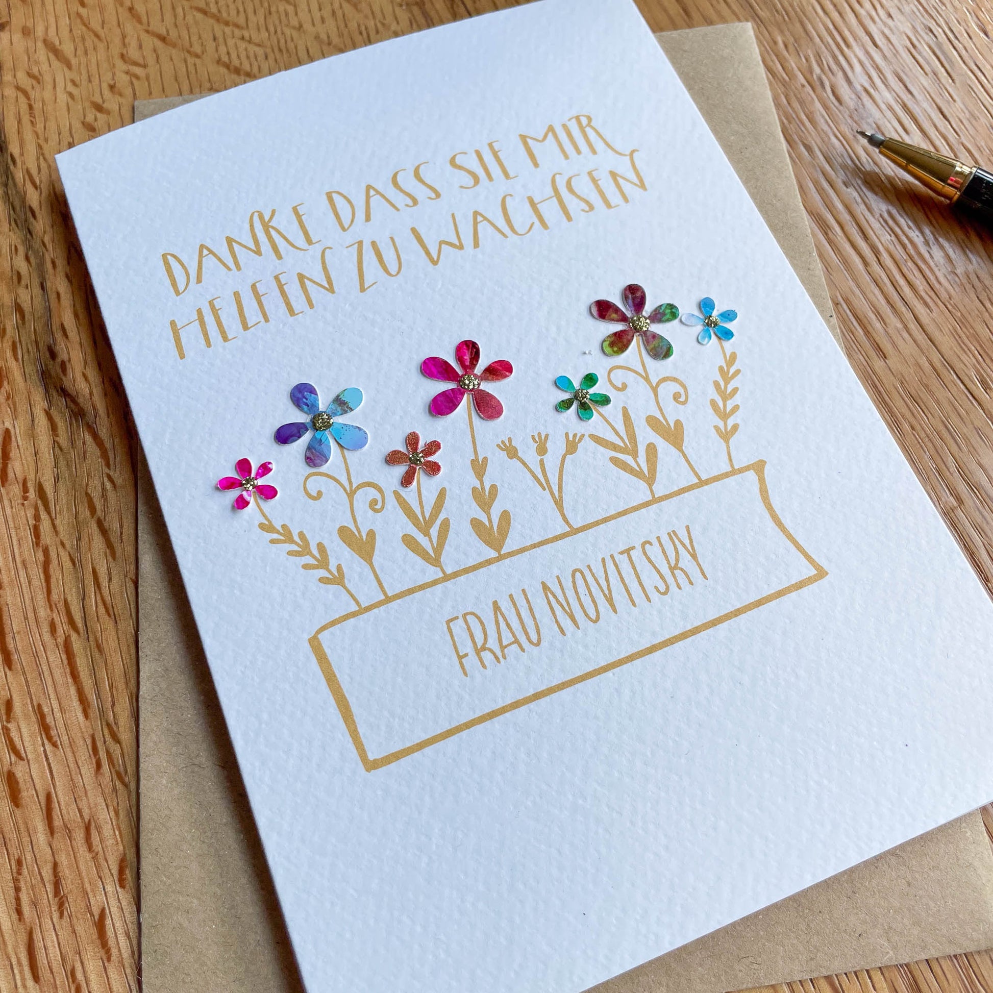 Express your gratitude in a heartfelt way with our unique personalised handmade card featuring the German phrase 'Danke dass Sie mir Helfen zu wachsen', which means 'Thank you for helping me grow' in English.