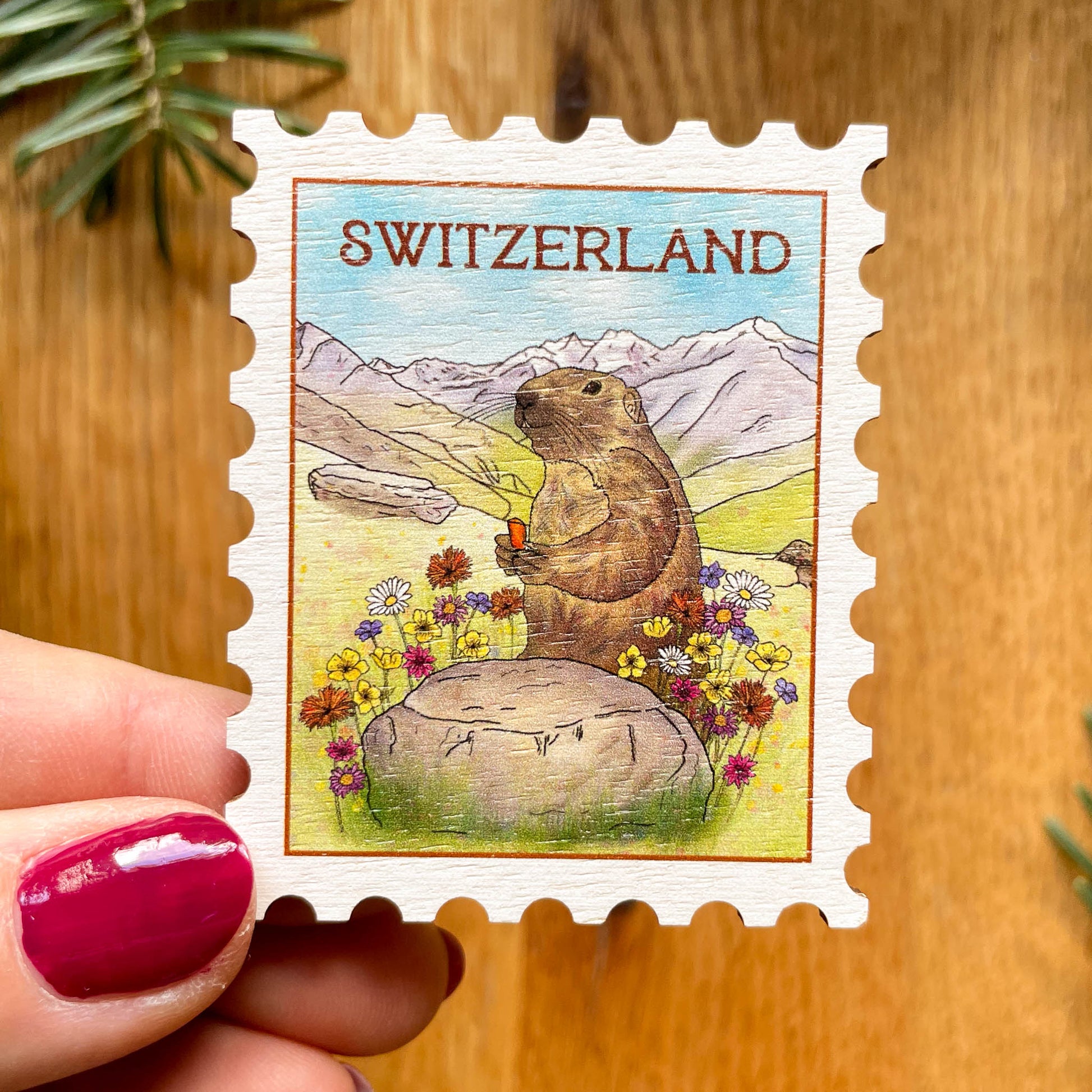 A beautiful postage-stamp style magnet featuring a Swiss marmot (matching the Deer & Sparrow marmot range) with alpine flowers and mountain backdrop. 6 × 5 cm rectangle with a 20 mm magnet on the back. A thoughtful pick for tourists, Swiss friends and family, expats, Christmas visitors, travel collectors, and nature lovers.