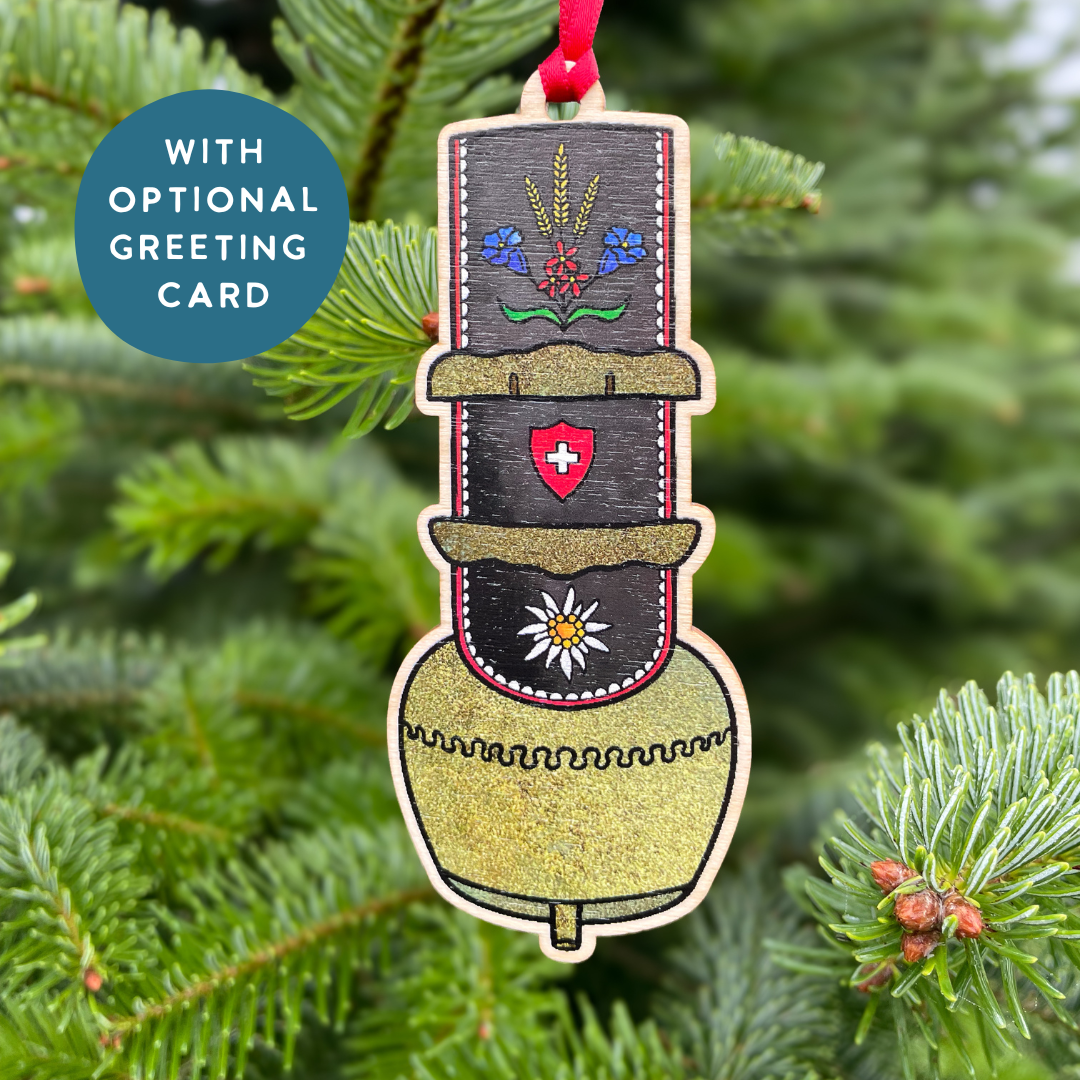 Seeing this decoration on your Christmas tree every year will invoke the memory of what the cowbell sounds like, leaving your imagination to take you on trips back to Switzerland or the Swiss Alp Valleys.