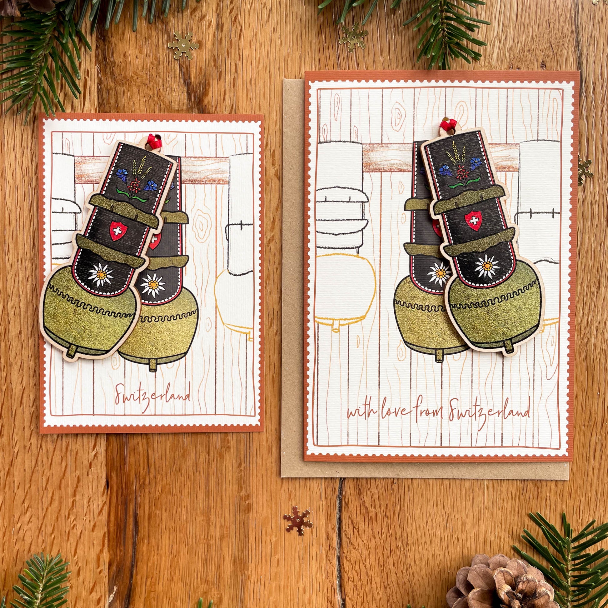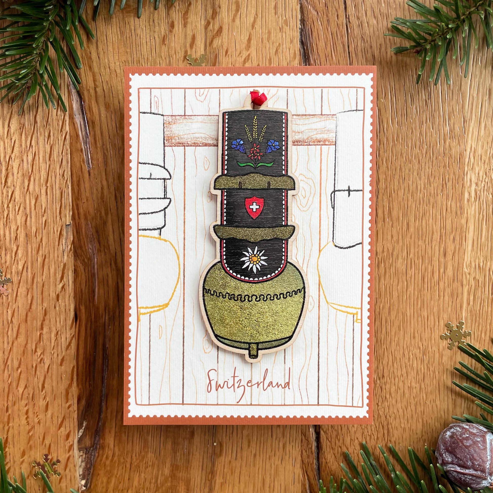 The decoration comes attached to a Greeting card with cursive text which reads ‘With love from Switzerland.’ The cowbell appears to be hanging on a wooden beam alongside the outlines of other cowbells as would be seen in traditional areas. The wooden barn effect is increased by the hand drawn wood effect planks behind the cowbells and beam. The surround to the card has a stamp style edging against a coloured background increasing those holiday memories.